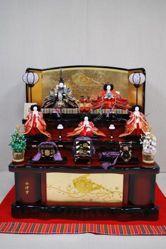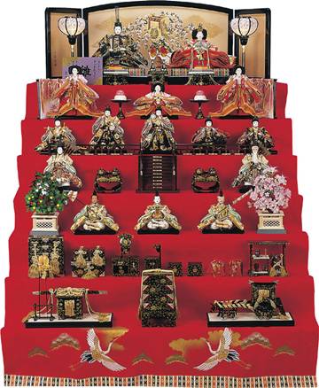 親王(雄雛と女雛)が一番上で、次が三人官女、その次が五人囃子で、その下に左大臣と右大臣。さらに下に仕丁が三人いて、その下に牛車や家具などの飾り。